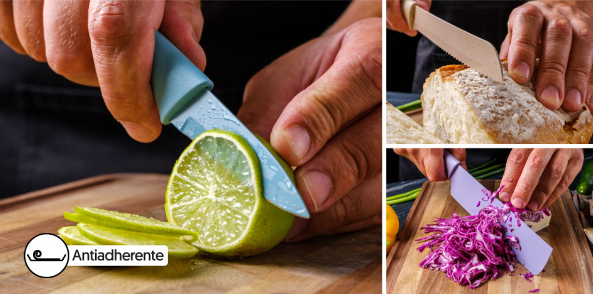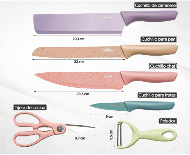 Las asas están diseñadas ergonómicamente con material antideslizante para garantizar la seguridad. Cada cuchillo tiene un excelente equilibrio de longitud y peso entre la hoja y el mango.